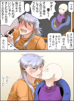 ペドロも普段は記念日とかほとんど気にしないタイプです。 ダッブさんは、相手からキスされるときは目を開いたままですが、自分からするときは目をつむります。絵面的に大変区別しやすい。