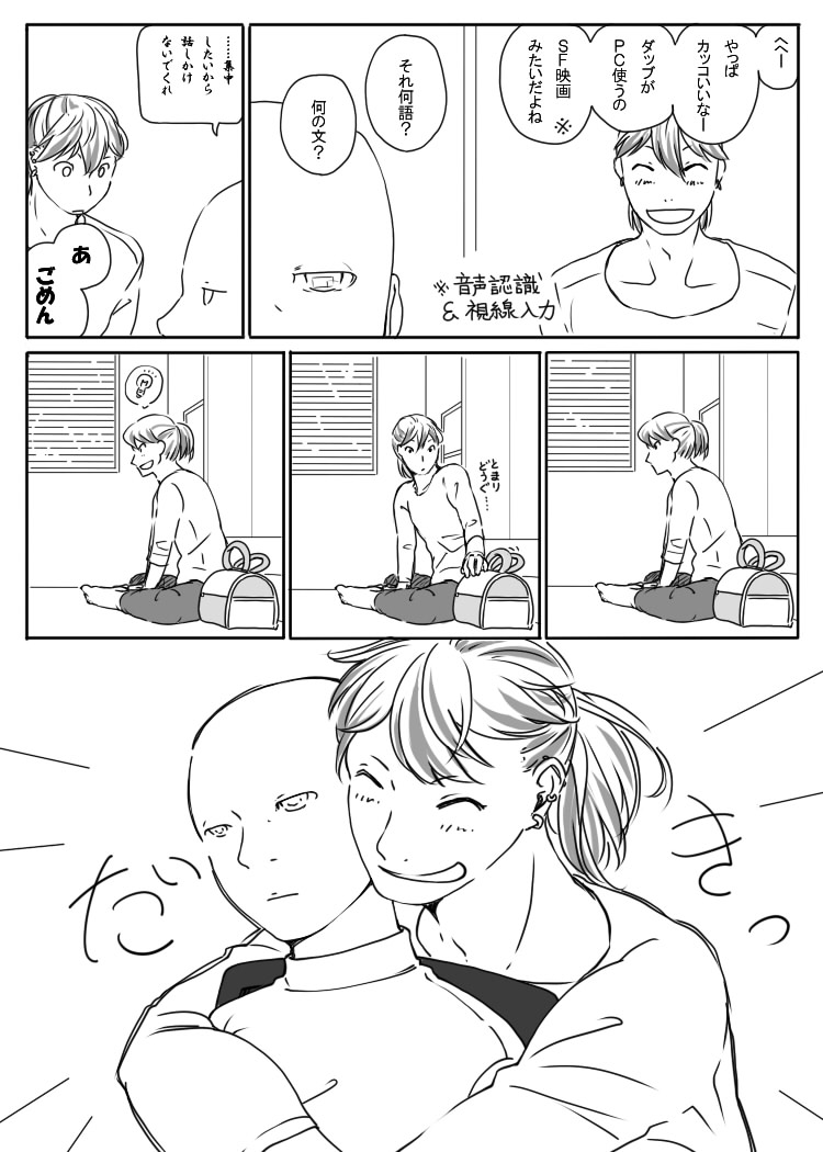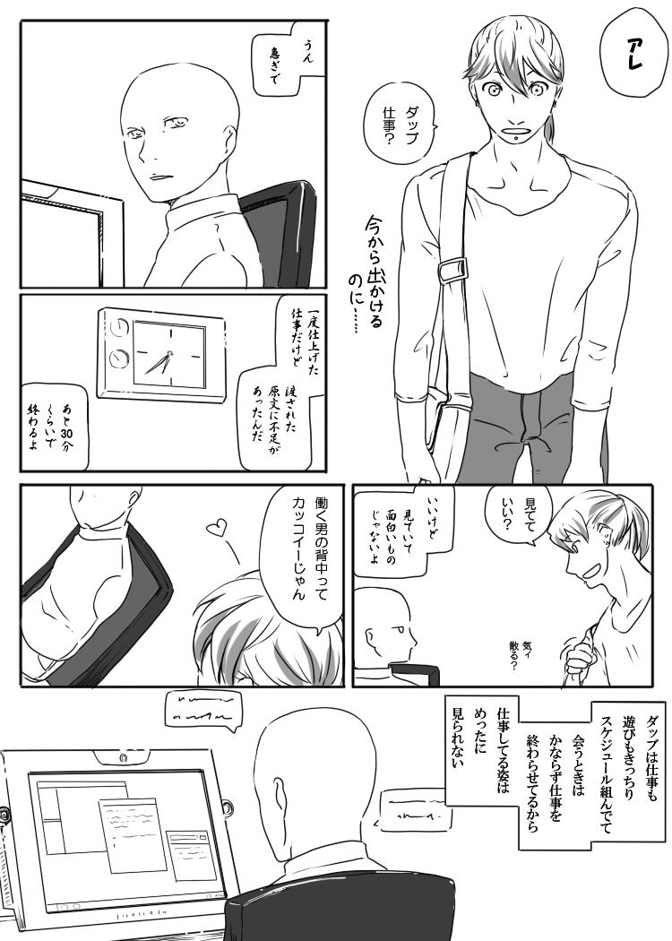 元ネタというかアイデアのヒントは、『ザ・シムズ3』というゲームで、この2人に似せて作った同性カップルです。一方が小説を執筆中にもう一方が話しか けようとするけど、執筆が終わるまで話しかけられない……というシーンを見て、2人に直すとこんなんだなーと。ペドロは我慢できない。