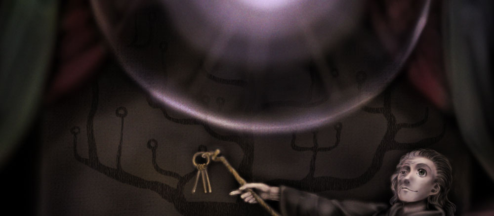 背景の壁掛けに描かれた系統樹は、当時の魔術師による世界原理の図解である。