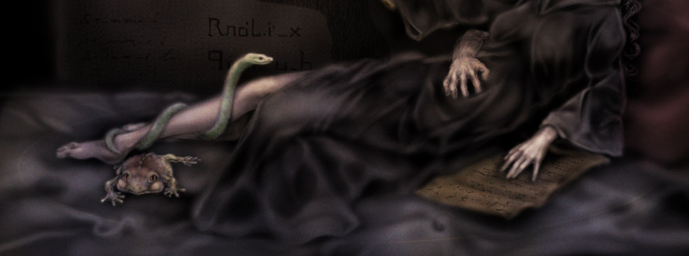 足下には毒蛇とヒキガエルが描き加えられている。これらは魔術師達が扱う恐ろしい毒物の象徴である。